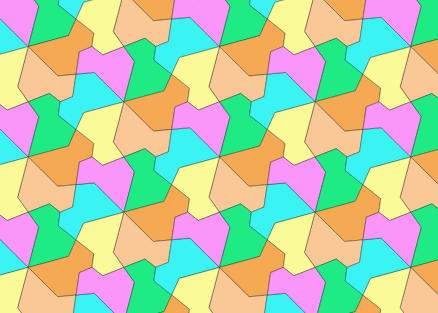 Here are some examples. The first is an irregular octagon which tessellates by rotation through 60° at some vertices and 120° at others. The second is a re-creation of Escher's "Lizard, 1937".
