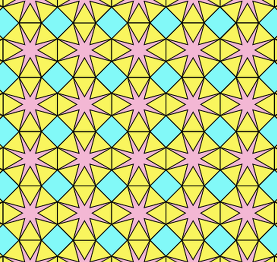Tessellate! can also be used for designing patterns which do not strictly follow the rule for semi-regular tessellations. In the example on the left below, the tiles overlap, while on the right the star shapes are not tiles at all, but "holes" in the tessellation: